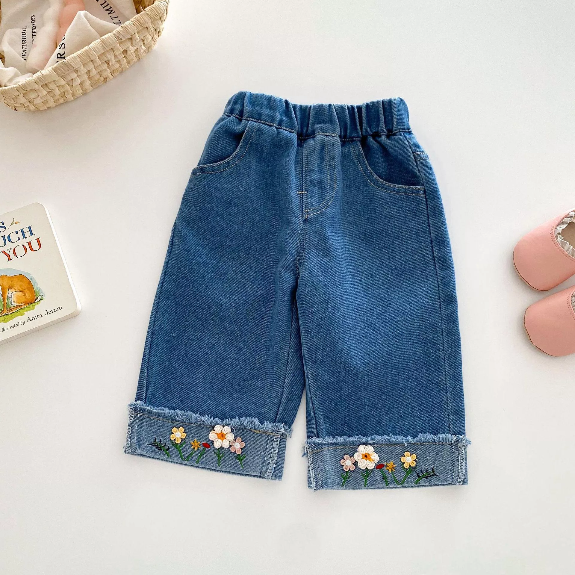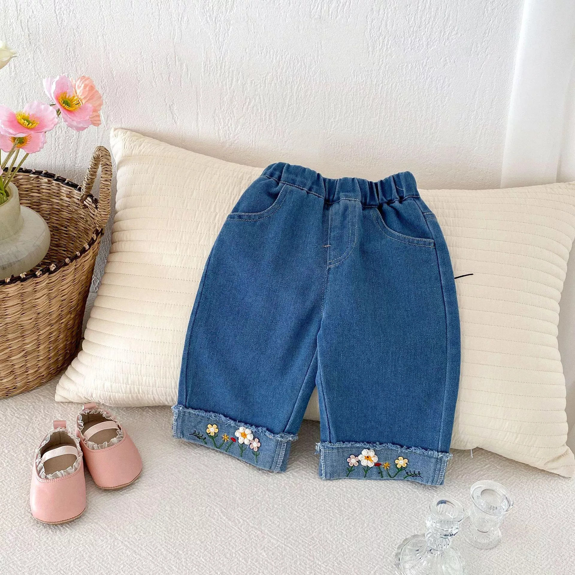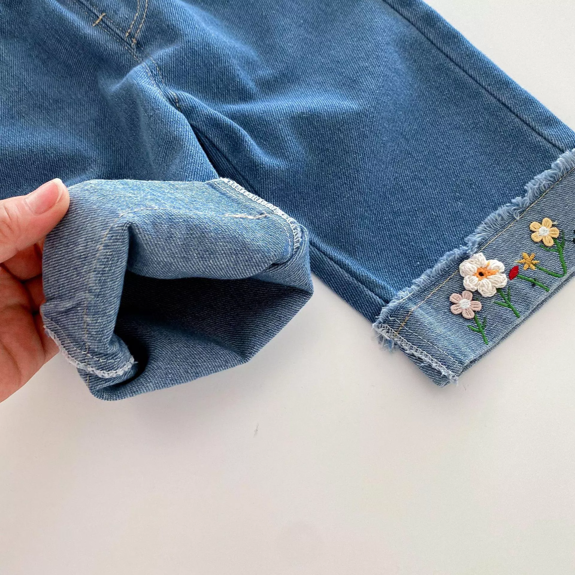 秋款韓版小花反摺牛仔褲