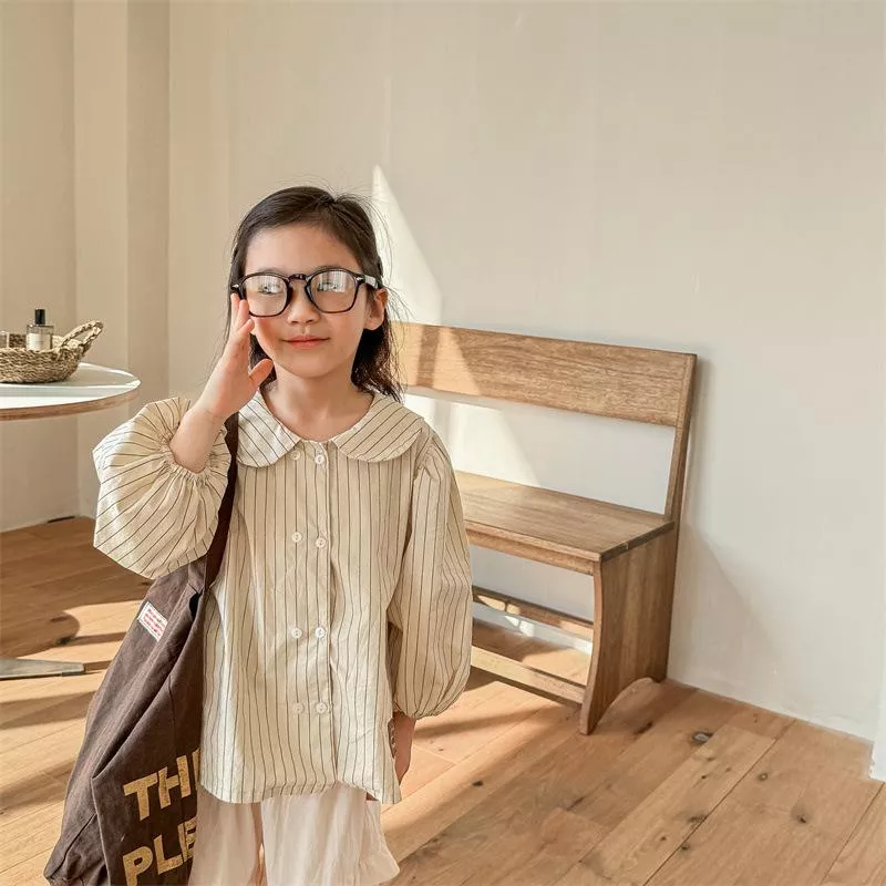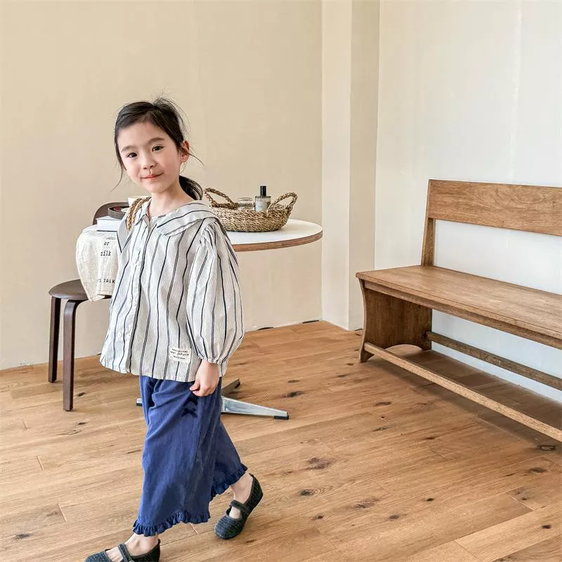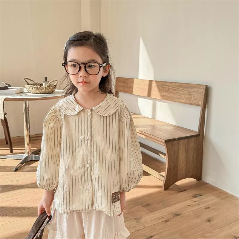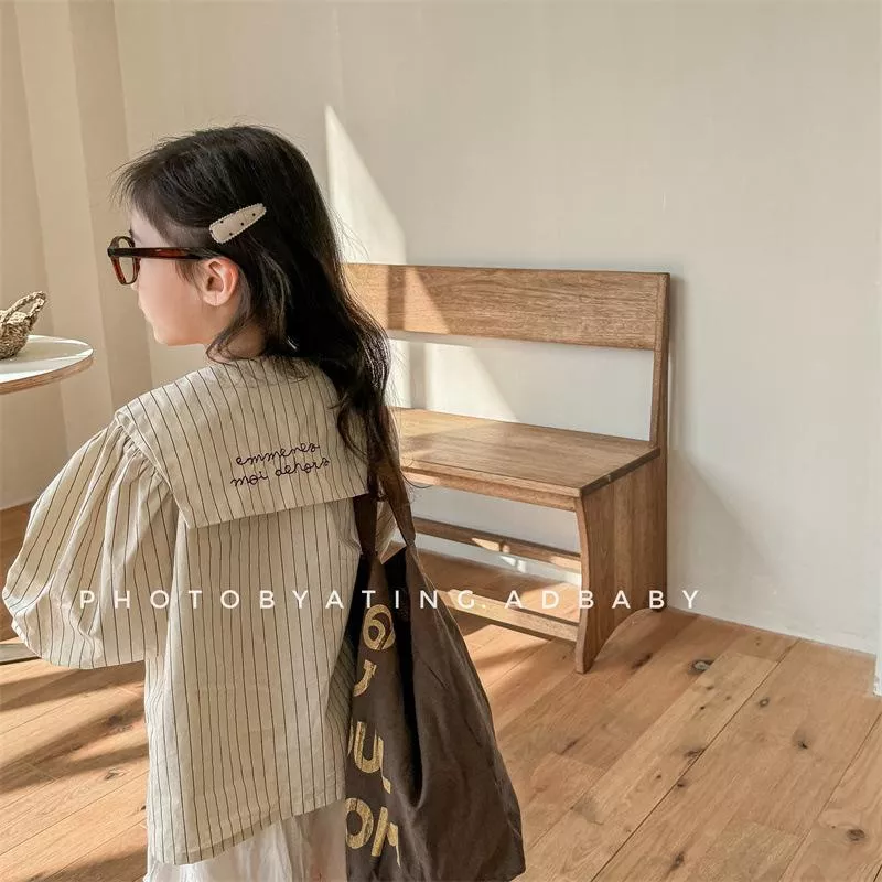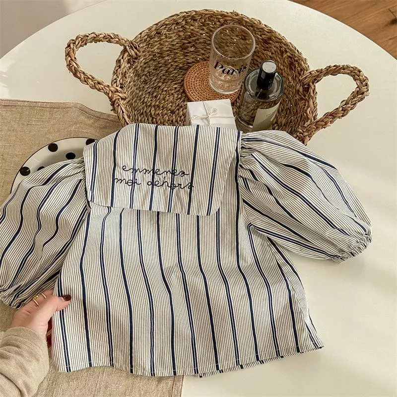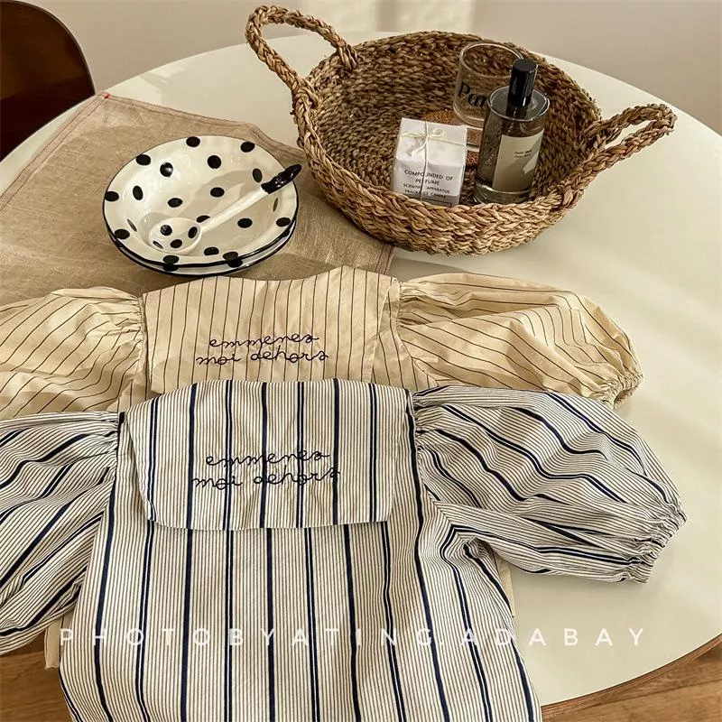 秋款韓版直條紋麻棉刺繡襯衫
